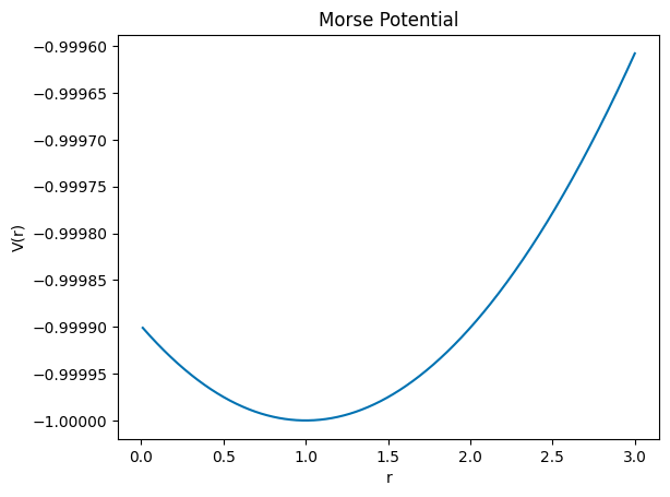The Morse potential is a convenient model for the potential energy of a diatomic molecule. The potential is a radial one and thus one-dimensional. It is given by,